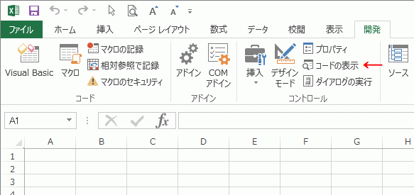 Excelを起動し、リボンの[開発]〜コントロール グループの[コードの表示]をクリックします。