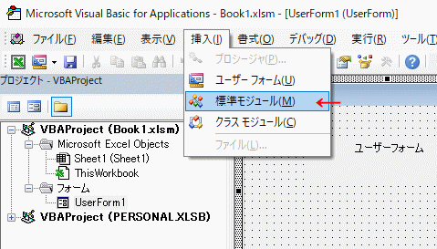 VBEウィンドウのメニュー[挿入]〜[標準モジュール]をクリックします。